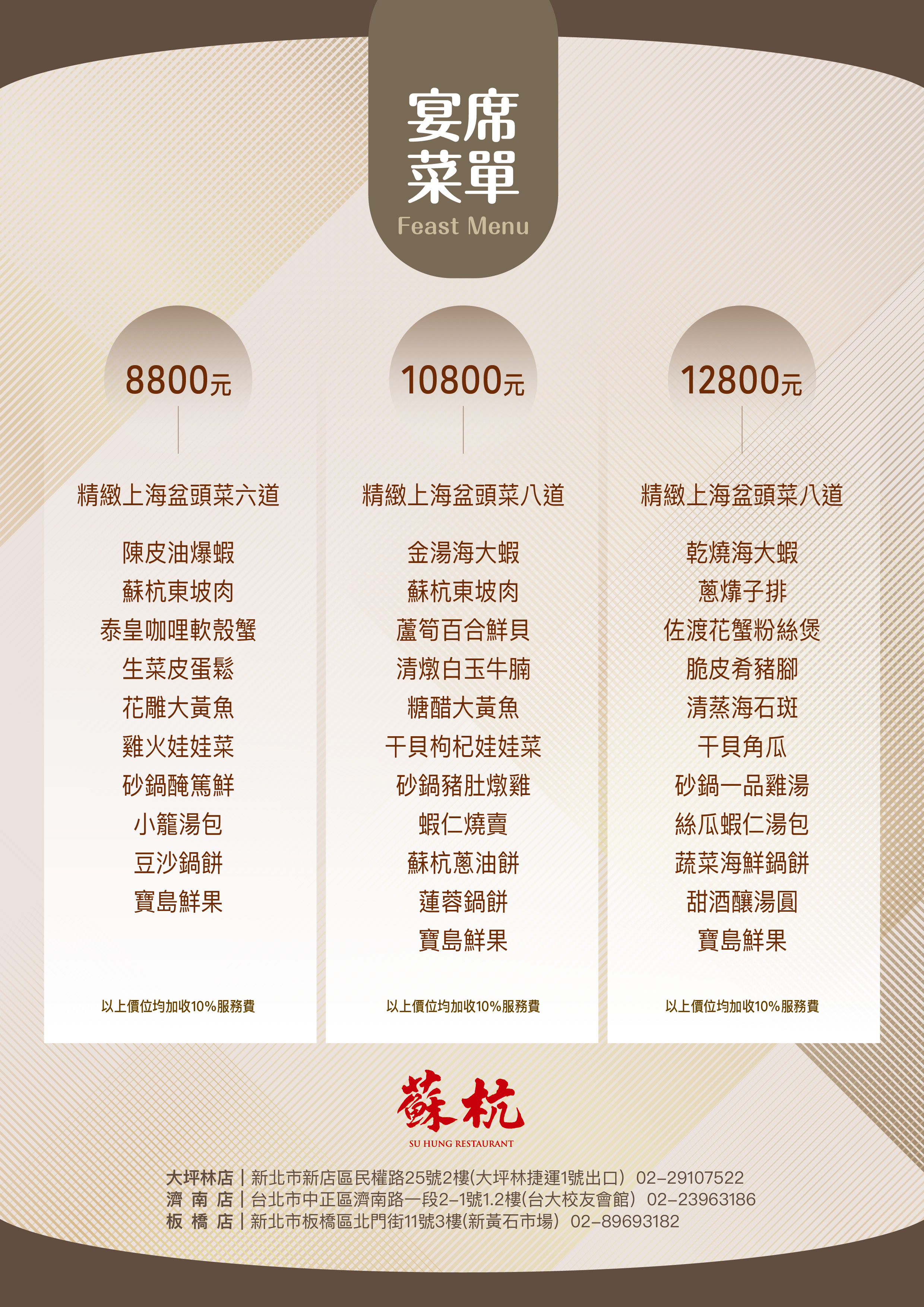 菜色介紹Dishes presentation Point Home > 蘇杭 > 菜色介紹 預定菜色 尾牙春酒 除夕團圓 初二回娘家 宴席菜單 冷盤 肉品 海鮮 蔬菜豆腐 點心 飯麵 湯羹 風華合菜 宴席菜單 NT$8800-12800 回上一頁 下一則