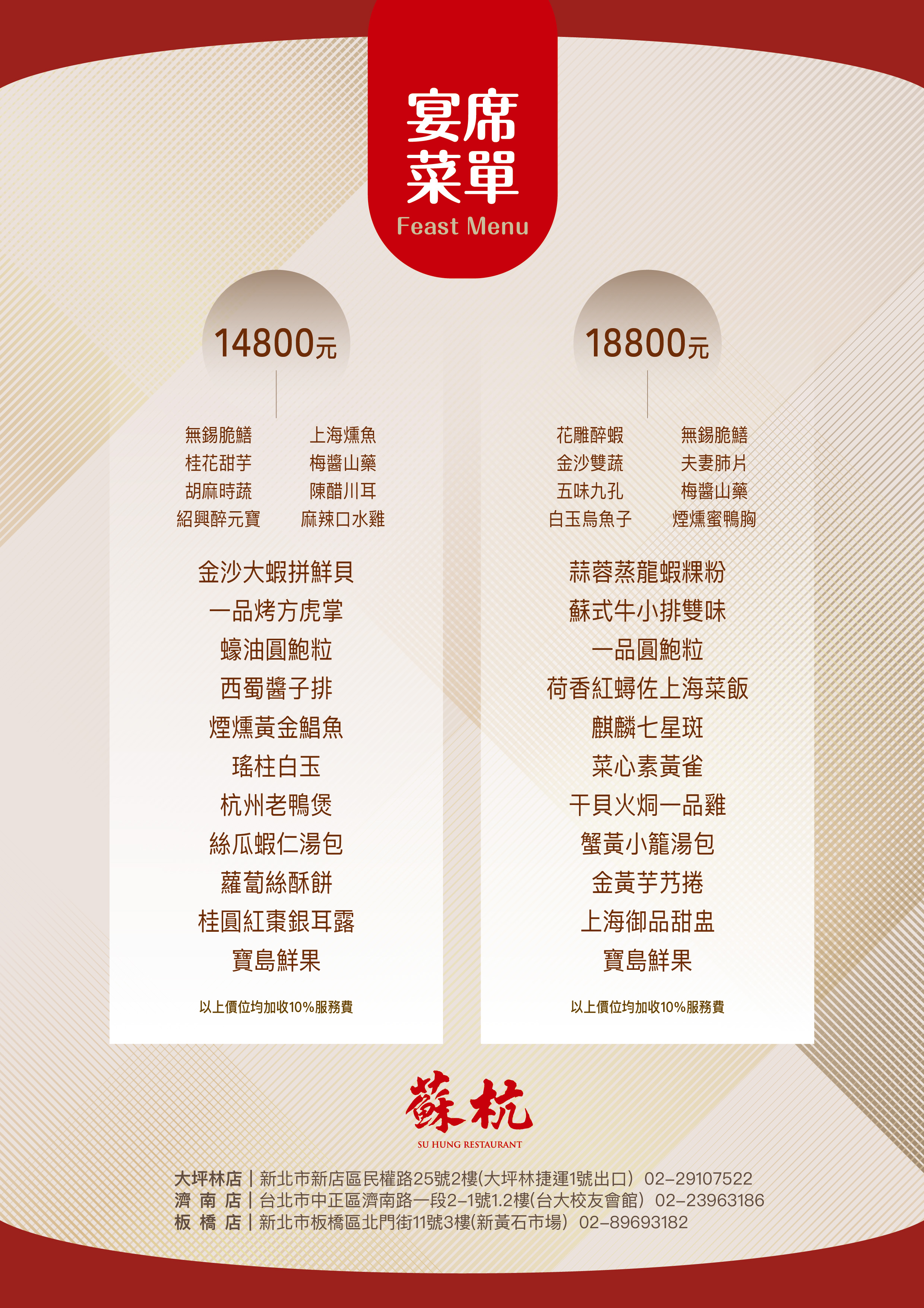 菜色介紹Dishes presentation Point Home > 蘇杭 > 菜色介紹 預定菜色 尾牙春酒 除夕團圓 初二回娘家 宴席菜單 冷盤 肉品 海鮮 蔬菜豆腐 點心 飯麵 湯羹 風華合菜 宴席菜單 NT$14800-18800 回上一頁 上一則