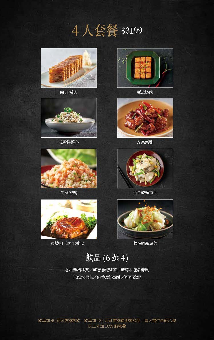 菜色介紹Dishes presentation Point Home > 蘇杭365 > 菜色介紹 母親節菜單 組合套餐 宴席菜單 風味冷盤 海珍河鮮 精饡肉品 時蔬豆腐 飽食麵飯 品饡鮮湯 上海點心 創意飲品 微醺調酒 4人套餐 NT$3199 回上一頁 上一則 下一則